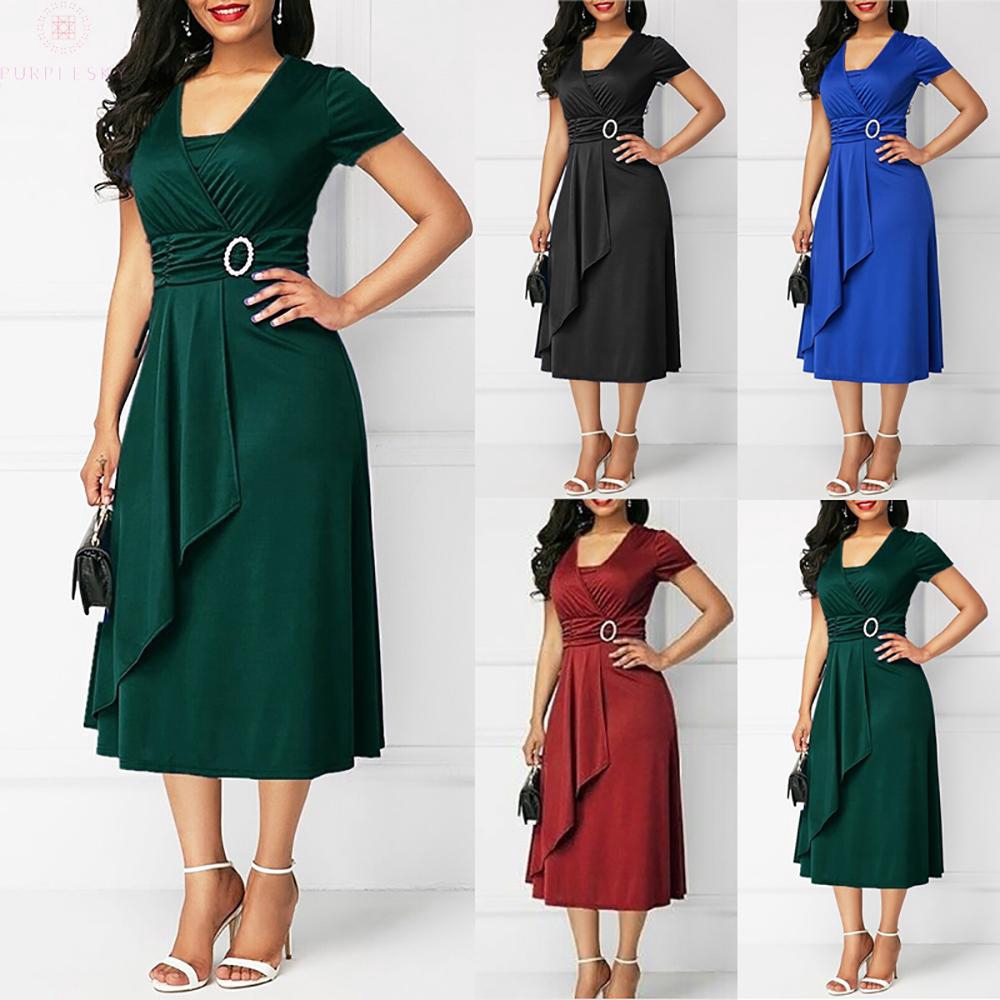 Dress Plus Size Holiday Ladies Evening Cocktail Midi Short Sleeve V Neck Solid Color Plain Shopee Philippines